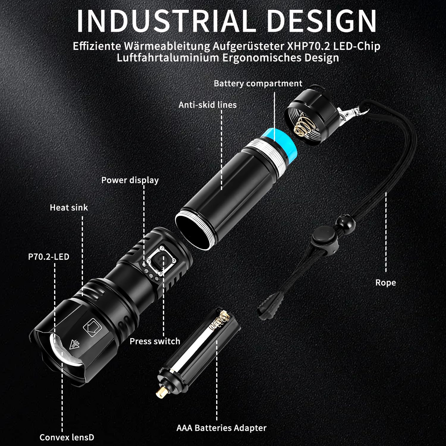 • LED torch extremely bright: LED torch is equipped with an XHP70.2 chip, which allows a light output of 100,000 lumens. A 150 square metre room can be easily illuminated, you can also focus objects up to 500 metres away. Perfect for outdoors, hiking, camping, fishing, emergencies and also an ideal gift for men.